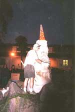 Left - early in the morning, when fiber blanket had just been removed. Right - Nina later in the day, when clean-up was under way. After-note: Unfortunately, the arch was badly vandalized, and eventually had to be removed, so it no longer can be seen on campus. These pictures are the only public record, but many people photographed it during the workshop. |