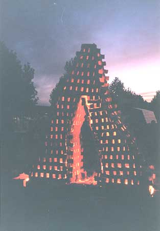 This wonderful piece was a clay lined hole in the ground which one could retreat into, meant to be accessed by a removable grill. (It's the grill you see in the photo.) In this view, the fiber has just been removed at the end of firing. After-note on this piece: It just couldn't take the stress; perhaps it wasn't quite dry enough. When it cooled, it was seen to have such serious cracks that it had to be covered in order not to be a public hazard. |