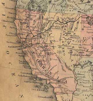 This 1884 map of California was cropped from a larger map, labeled as above. The accompanying text is below. I was born and grew up in California, and witnessed many of the changes in the last half of the 20th century. The state is now almost, except for the physical features, unrecognizable from the description below! I think the black line going from west to east on the map, is the railroad over Donner summit